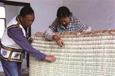 眼下正值,农闲时节。可纳雍县鬃岭镇小屯村王祖康夫妇并没有闲着,一得空闲,两老就合作打草席,60岁的王祖康搓草绳,他60岁的妻子左光群就坐在织席架前熟练地编织草席,非常和谐。