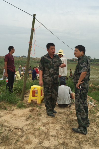 江西联圩镇党委书记夏维浩和镇长邱新农在东岸处理泡泉现场