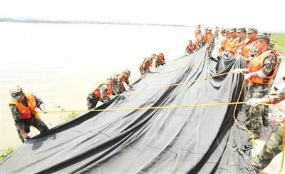 图为武警官兵在黄湖东南大堤加固堤坝(7月17日摄)。当日,在宿松县复兴镇黄湖东南大堤东南段,武警安徽总队宿州市支队官兵为堤坝披上雨布,垫上石子包,加固堤坝。我们江胜摄
