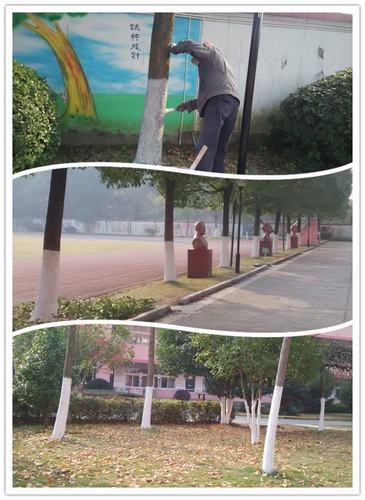为了切实增强校园绿化的抗冻、抗病能力,目前各项绿化养护管理工作正在细致、有序地开展:首先组织绿化工人对病株、死树进行集中清理,对植物进行开盘、冬灌,同时进行整形修剪,其次利用近期的晴好天气重点对树木进行涂干刷白、对部分栽植时间较短的落叶乔木、铁树等采取绑草绳等措施做好防冻保暖工作,确保绿化安全过冬,为打造美丽校园作出贡献。