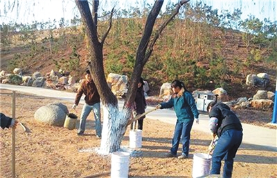 6、树干涂白:用石灰加石硫合剂对枝干涂白,可以减小向阳面皮部因昼夜温差过大而受到的伤害,同时还可以杀死一些越冬的病虫害。